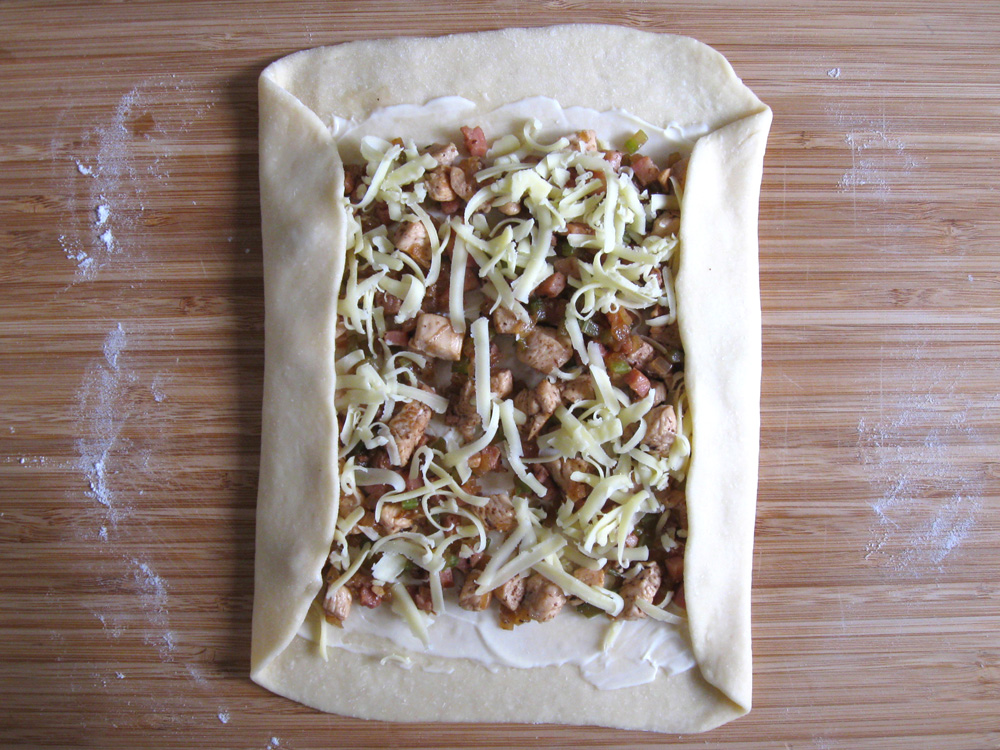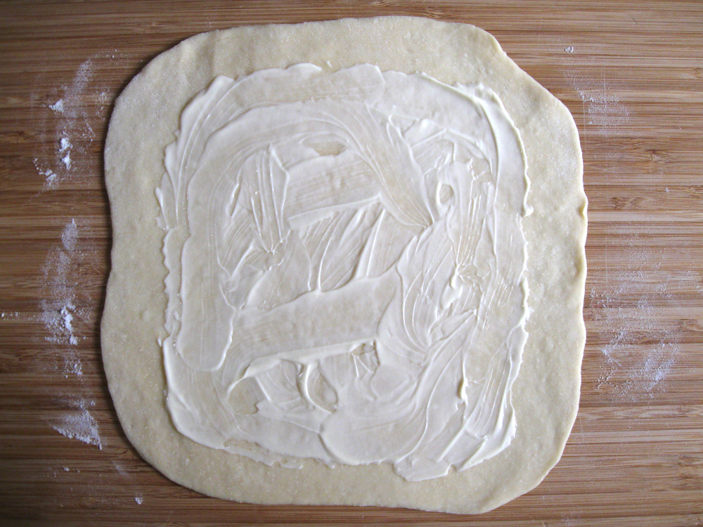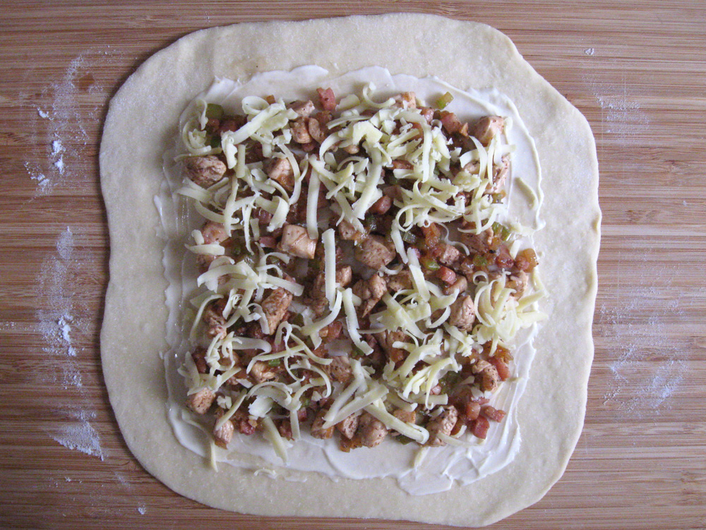 - Divide the dough in half. On a lightly floured surface, roll out each portion into 5-6mm thin rectangle. Spread Mayonnaise OR Caesar Salad Dressing and 1/2 Chicken Filling, sprinkle with some Grated Tasty Cheese.