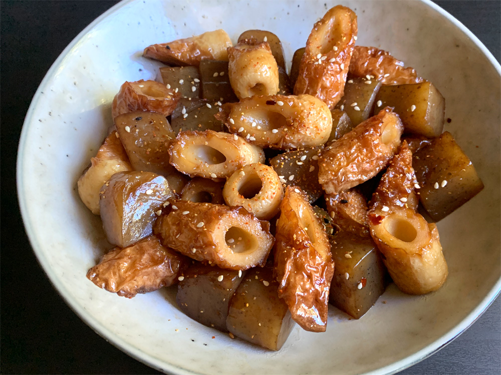 - Add Chikuwa, and stir until the Sauce is gone. Sprinkle with some Toasted Sesame Seeds and Shichimi (Japanese Chilli Spice Mix), and serve.