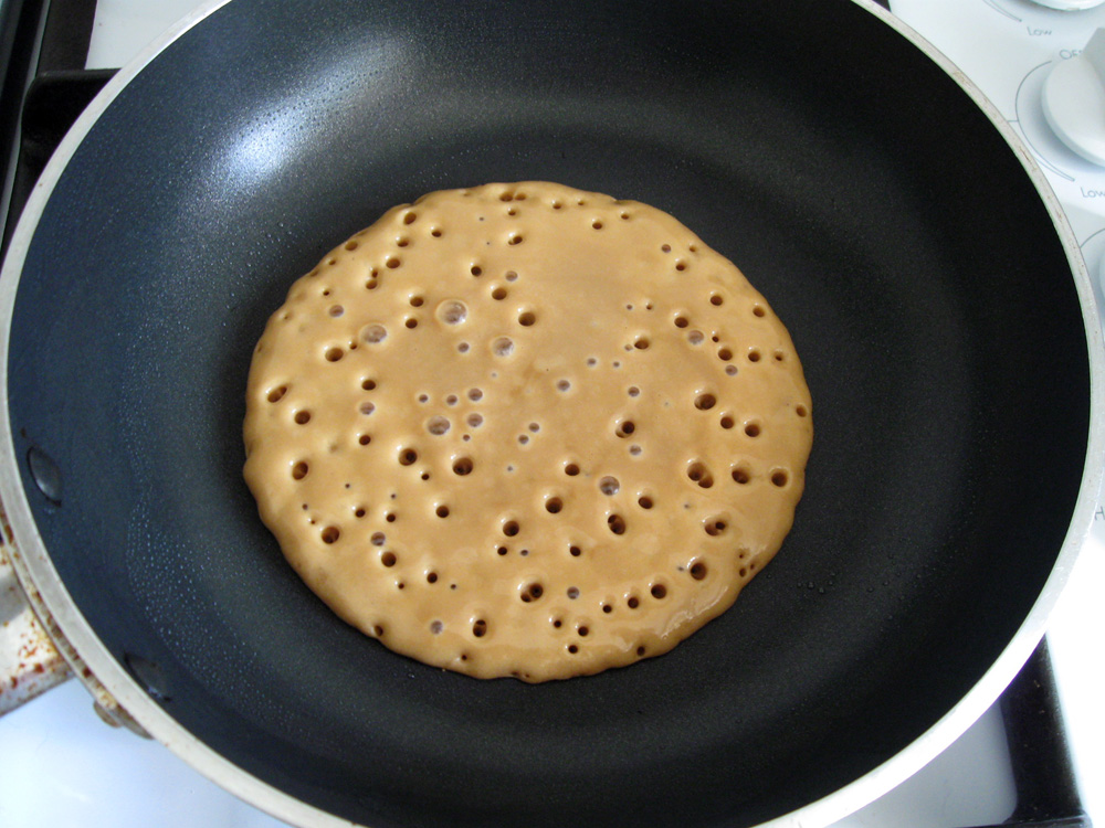 - Heat a frying pan (non-stick preferred) over lower heat. Oil the pan very lightly and cook small pancakes, about 12cm in diameter, until bubbles appear on surface and the edges get cooked. Carefully turn as the pancakes are soft, and cook for 1 to 2 minutes.