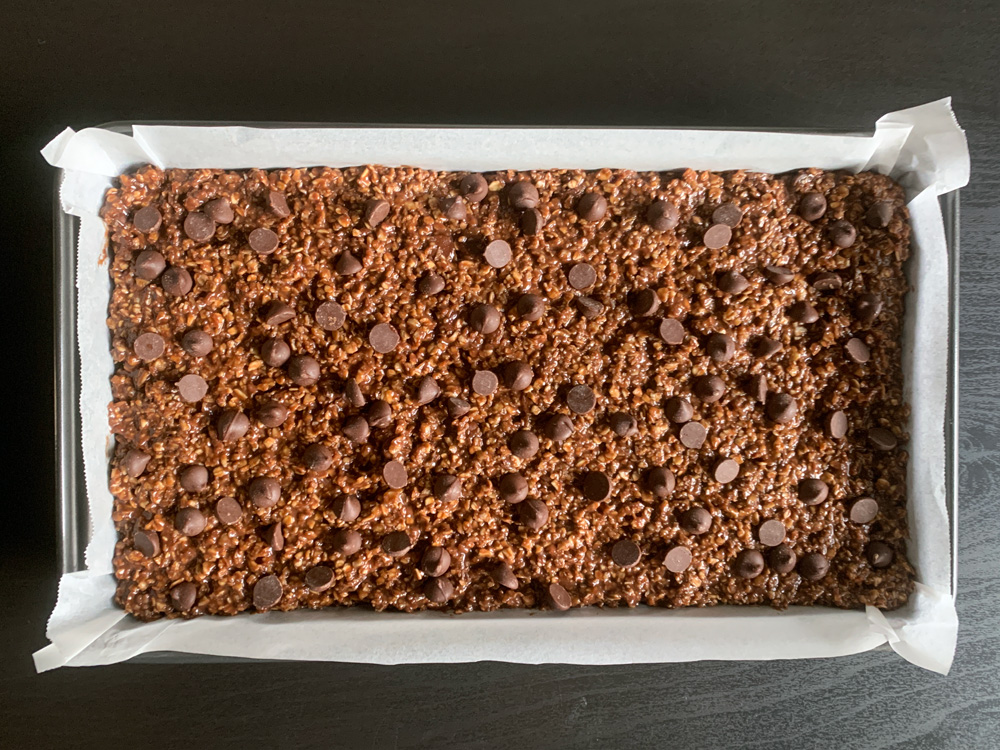 - Add Butter and mix to combine. The heat will melt the Butter, and the cold Butter cools the Oats. Add Cocoa Powder, Sugar, Salt and Baking Powder, and mix well. Add Eggs, mix well, then add Desiccated Coconut and Dark Chocolate Chips, and mix to combine.