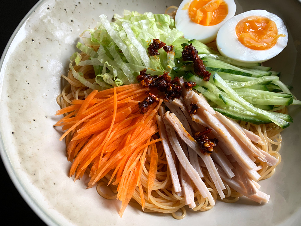On a hot summer day, you don’t want to cook Pasta? Angel Hair Pasta (Capellini) can be cooked in 2-3 minutes. Cool the cooked pasta in cold water, and mix with the fiery sauce. Add plenty of refreshing salad vegetable and some protein, I added Roast Pork and Boiled Egg today. It’s spicy, sour, sweet and salty. You will love this dish.