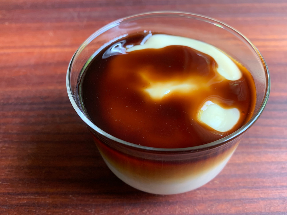 - Pour the Muscovado Syrup over the Soy Milk Jelly, add some ‘Kinako’ (Finely Ground Roasted Soy Beans) if you have it, and enjoy. The photo below is the same jelly set in a serving glass.