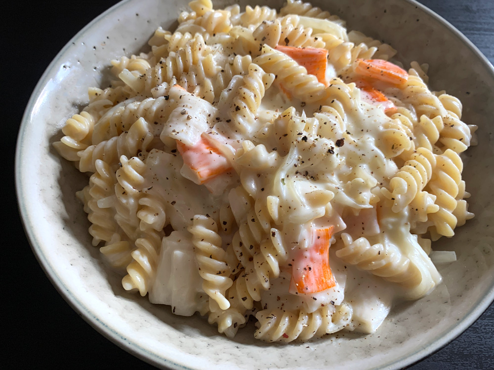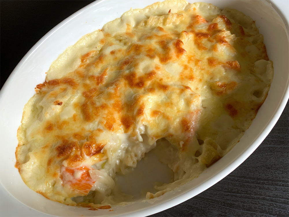 In Japan, there is a dish called ‘Crab Cream Croquette’, that is deep-fried crumbed thick mixture of Crab Meat and Cream Sauce. In Melbourne where I live, it is very difficult for me find real Crab Legs. Today I cooked the softer Crab Cream using Imitation Crab Meat, mixed Pasta with it, covered with Cheese, and baked it. The result was excellent. Of course you can use real Crab Meat, and that would taste nicer.