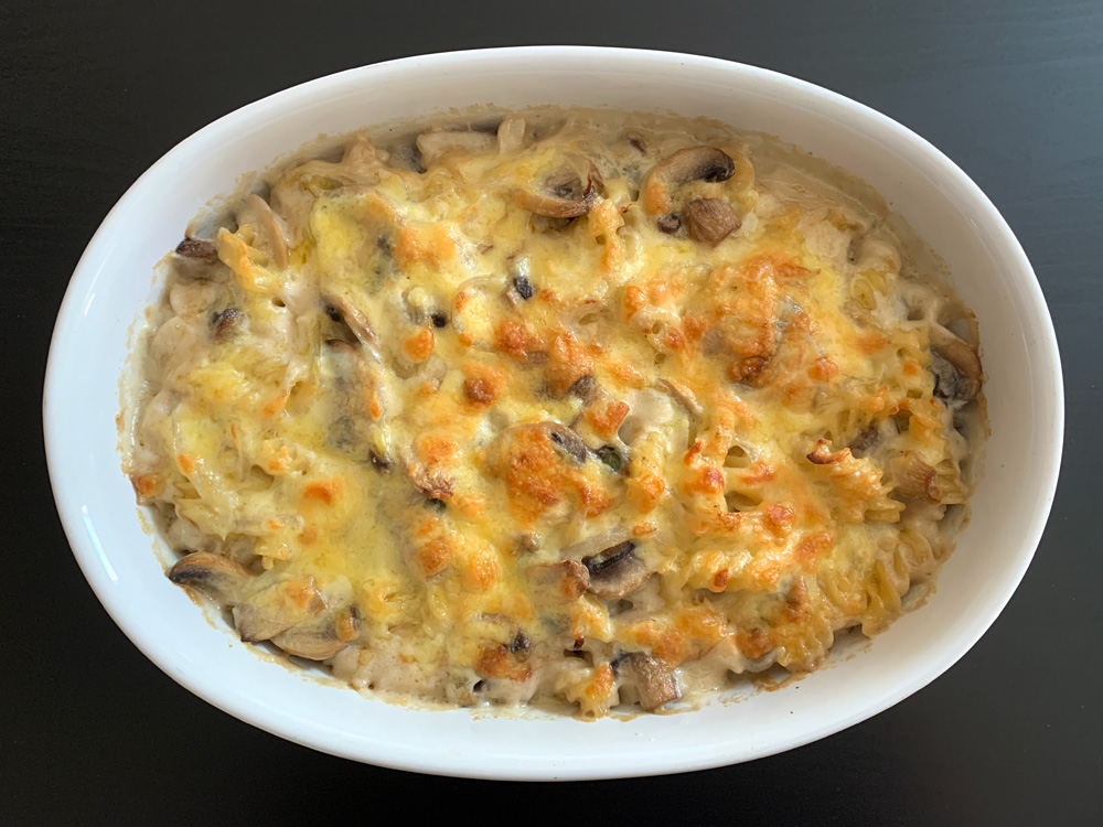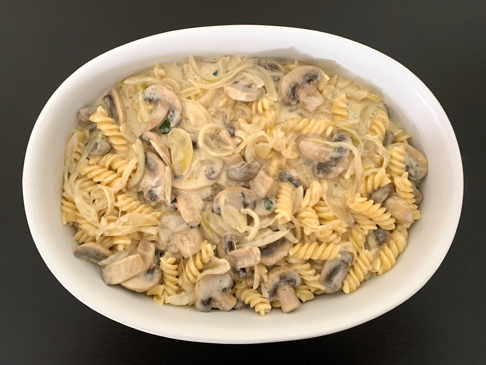 This is a delicious Pasta Bake, that can be served as a main dish OR a side dish. You may wish to add some Meat OR Chicken, but I like it just Mushrooms. Today I used common Cup Mushrooms, but you can use your favourite Mushrooms. I recommend to use a generous amount.