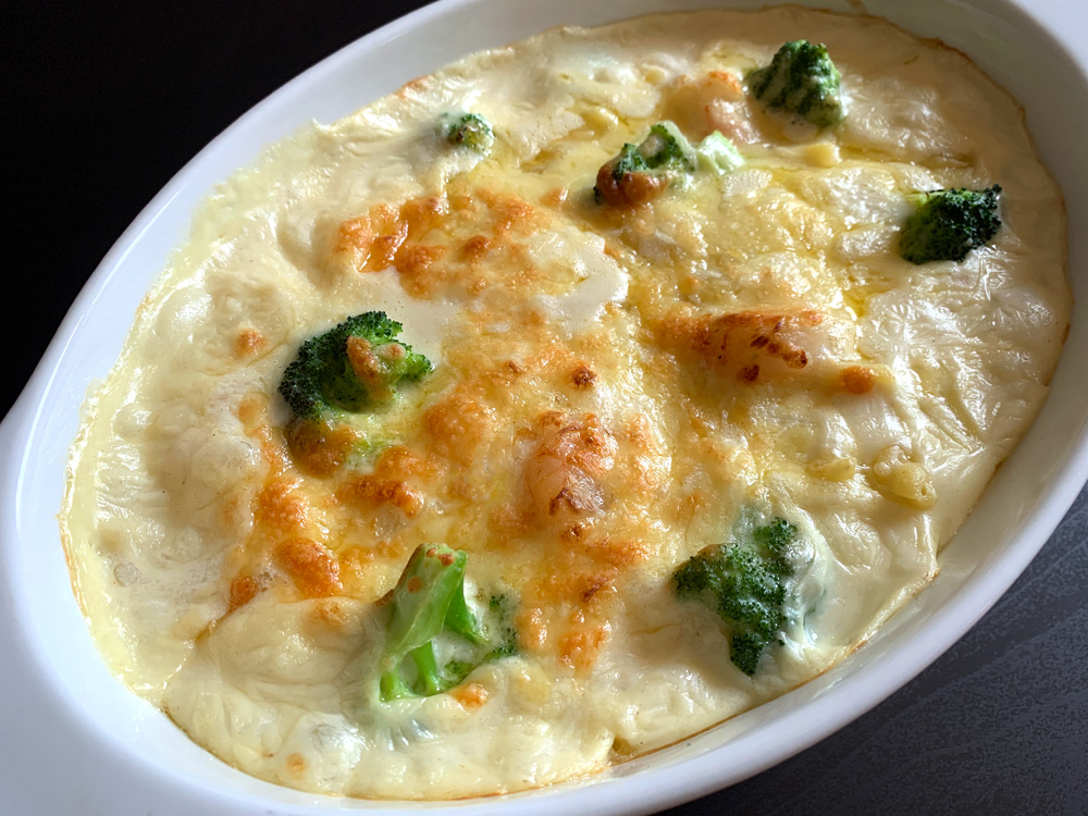 This dish is called ‘Ebi (Prawns) Macaroni Gratin’ in Japan, as Macaroni are commonly used. It is a very popular dish. However, in Melbourne where I live, Macaroni are very short and small, and I don’t like to use them for this dish. I use other Pasta such as Pennette, Trivelle, Gemelli, etc. You can use any Pasta of your choice. Broccoli is optional. You can use other vegetables such as Spinach, Asparagus, Peas, etc.