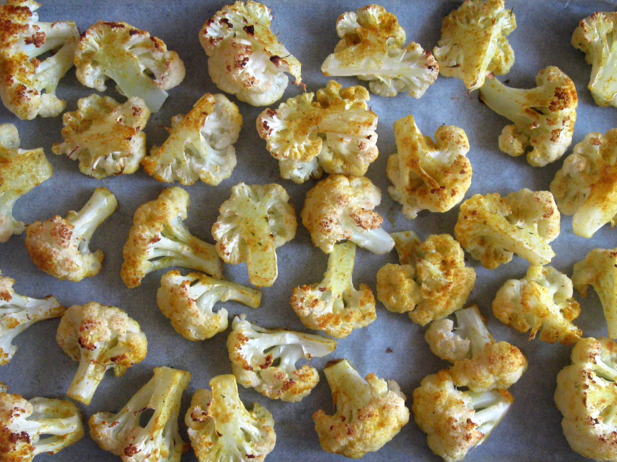 - Cut Cauliflower into florets and place them in a large bowl. Make sure the florets are about same size. Drizzle with Olive Oil and sprinkle with Salt and all spices, ensuring each floret is coated, toss so that all florets are coated with everything.