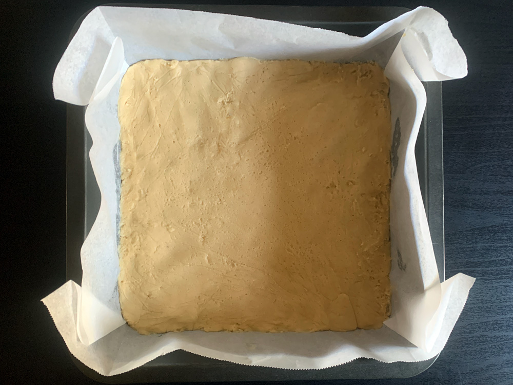 - Line a 20cm square cake tin with baking paper. Preheat oven to 160℃.