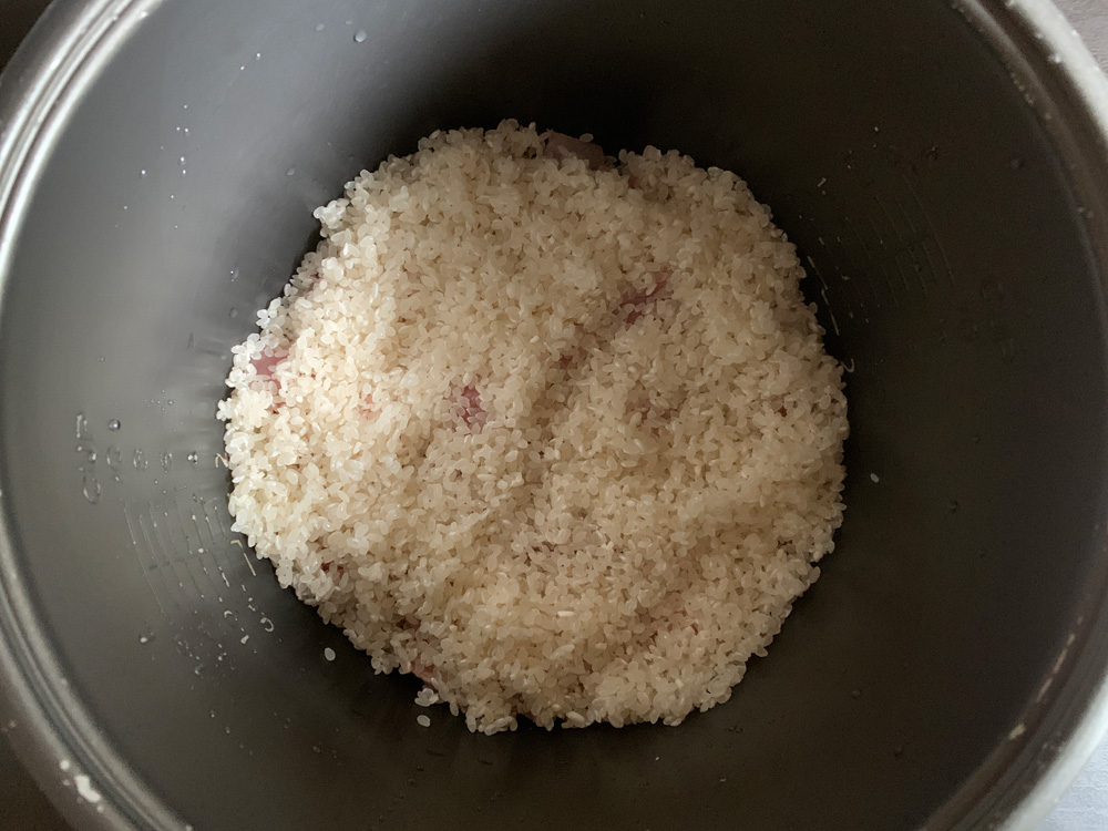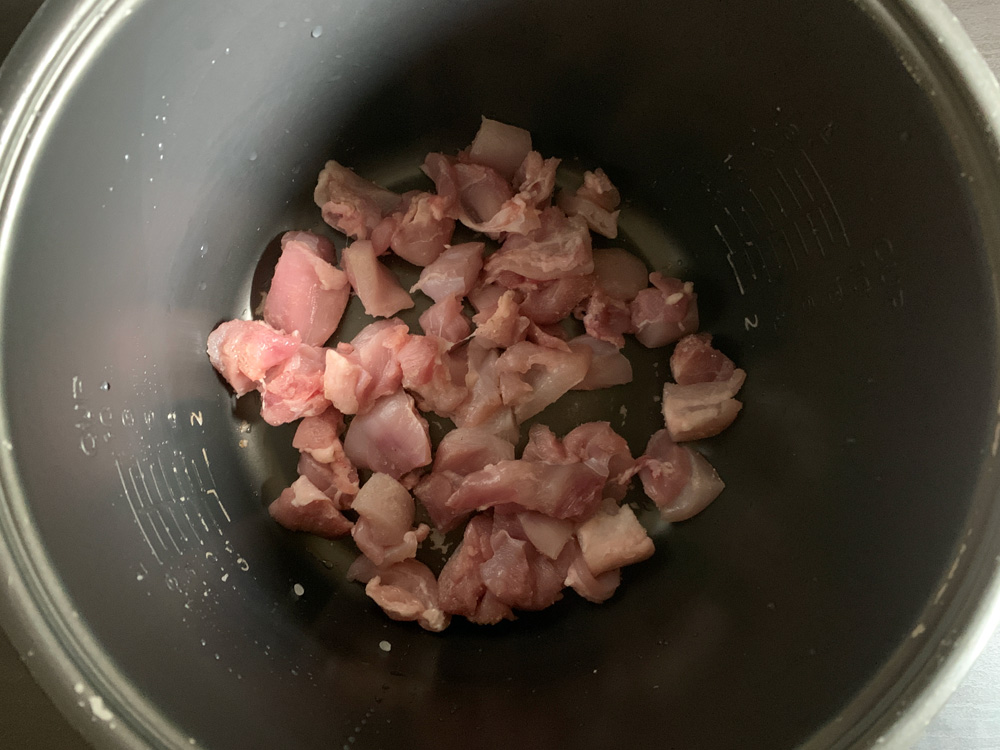 - Cut Chicken into small bite-size pieces, season with Salt and White Pepper, and place in the rice cooker’s inner pot.