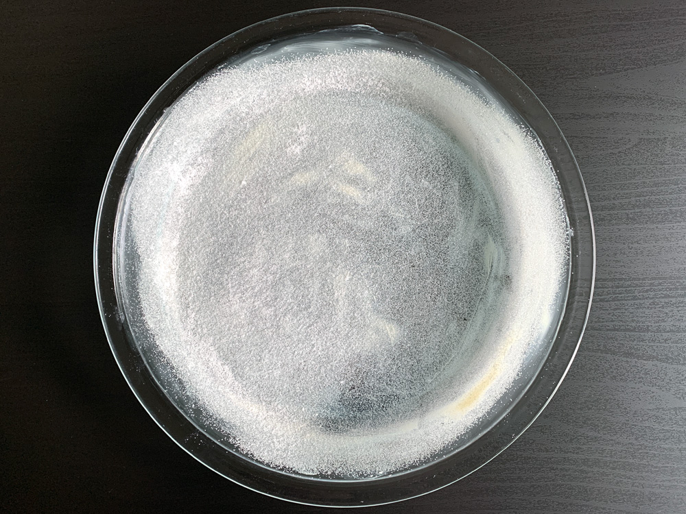 - Preheat oven to 170℃. Butter a pie dish and add a small amount of Caster Sugar to coat, shaking out any excess Sugar. *I used 22.5cm Pie Dish.