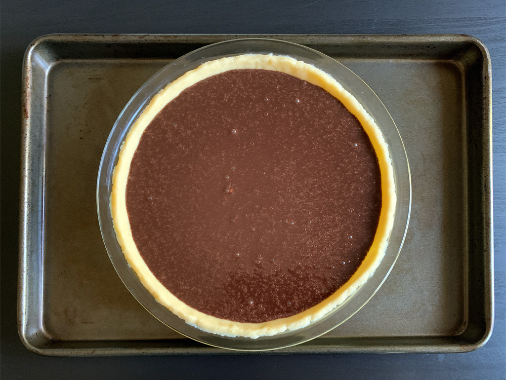 - Pour the mixture into the pie case, and bake for 40 to 50 minutes. If the crust edges get too dark, cover with a sheet of foil. Cool completely.