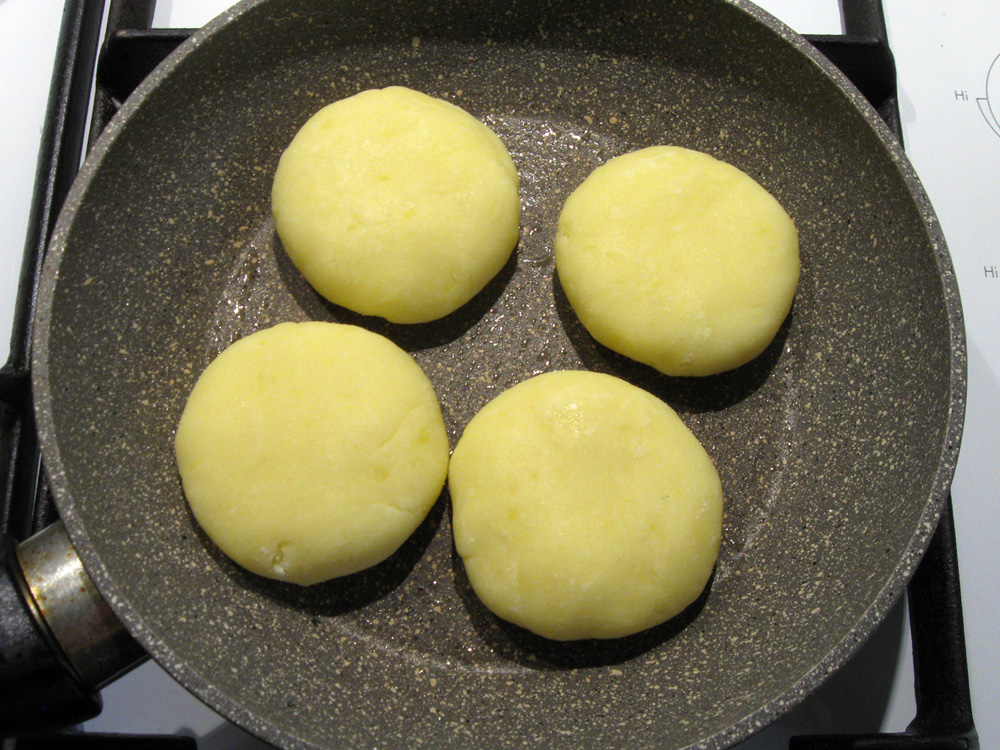 - Heat a frying pan (I used 20cm pan) over low heat, lightly Oil it, and cook the Potato Mochi for 5 minutes OR until bottom side is nicely browned. Turn them over and cook the other side as well. *Note: If you have a lid, cover the pan with the lid.