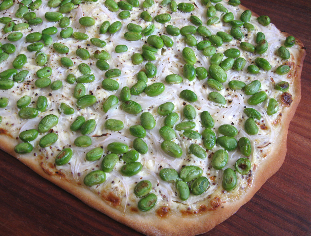 - Mix Sour Cream (OR Creme Fraiche) and 1 pinch Salt, add Wholegrain Mustard and mix roughly, spread on the base, scatter Onion and Edamame Beans evenly, and sprinkle with ground Black Pepper.