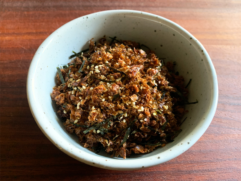 - Once it is dry, it must be easy to break into fine crumbs. Mix with Unused ‘Katsuobushi’, add Mirin and Soy Sauce. Alter the amount of Soy Sauce, depending on the amount of Bonito Flakes, to suit your taste. You can add Sugar for sweeter flavour.