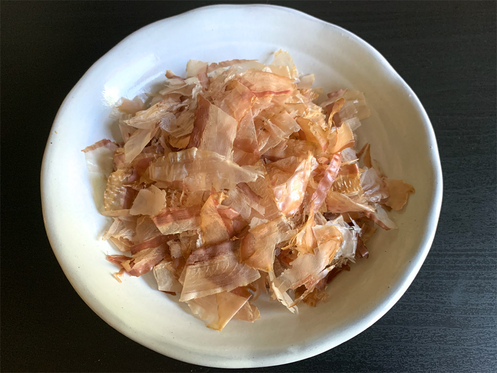 - ‘Hana Katsuo’ (Bonito Flakes) that’s been used to make Dashi Stock is wet. Squeeze to remove excess water, spread over a plate, and microwave at medium power, 500 to 600W, for 30 seconds. Then repeat, occasionally stirring, until completely dry.