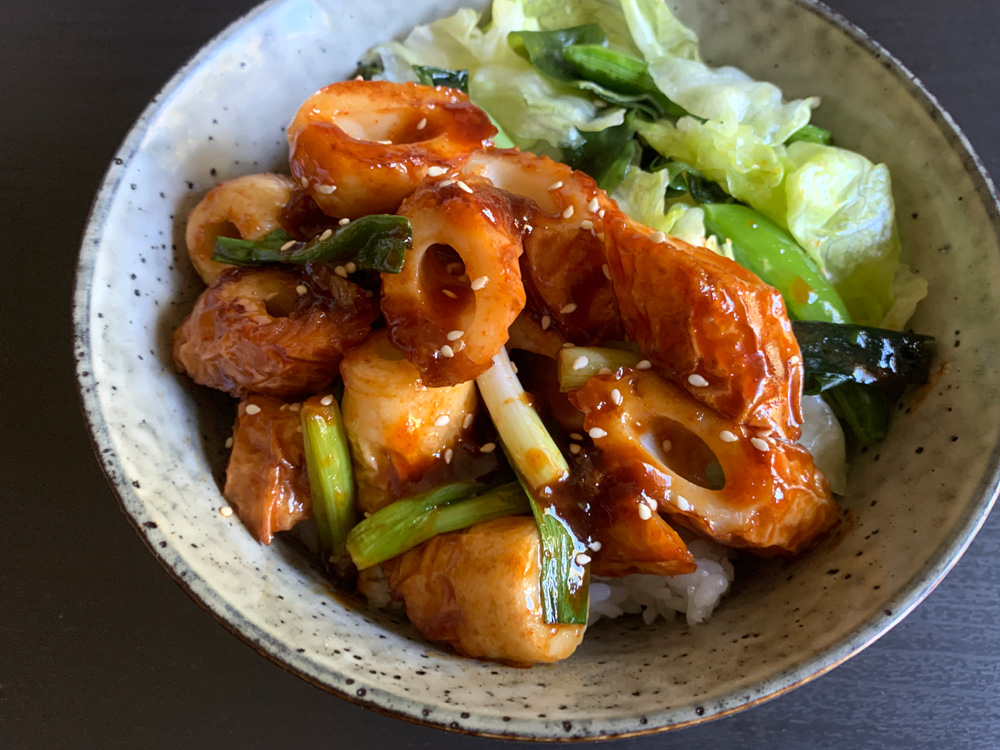 I use Soy Sauce, Sugar and Mirin to season many dishes. They are the Japanese staples. I added Gochujang (Korean Spicy Miso), Garlic and a little bit of Vinegar to this dish, and the flavour instantly changed from Japanese to Korean. The spicy and sweet sauce is very suitable for Chikuwa (Japanese tube-shape fish cakes) and this humble rice bowl was seriously yummy.
