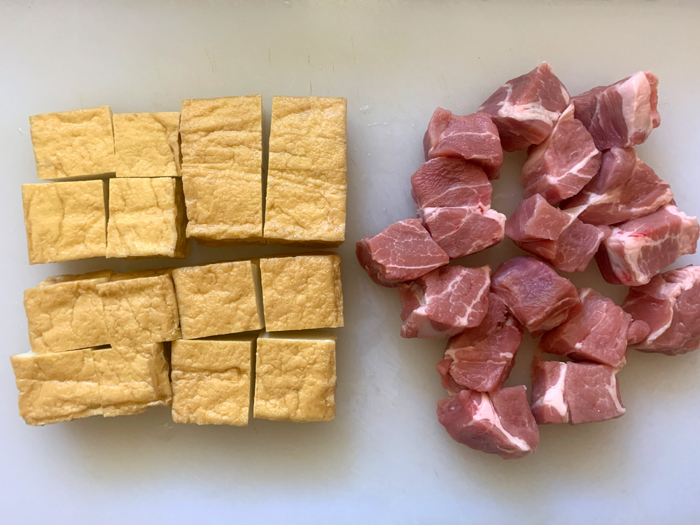 - Cut Pork and Fried Tofu into bite-size pieces. I cut them into about 3cm pieces. Lightly season Pork pieces with Salt & White Pepper.