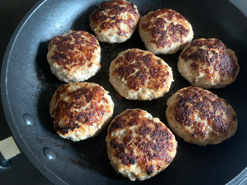 - Add all other ingredients, mix well to combine evenly, divide into 8 portions, roll into balls, and flatten into rounds or oblongs. *Note: You can make meatballs.