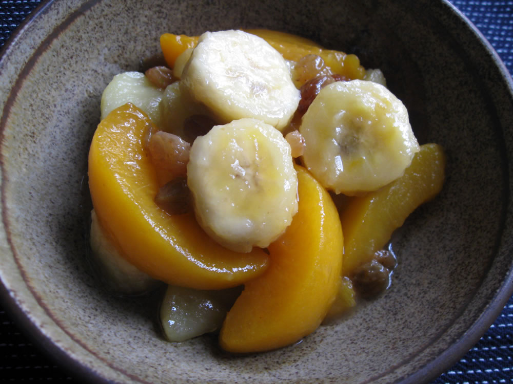 - Add Brown Sugar, Rum, Peach slices and Banana slices, and mix to combine well.