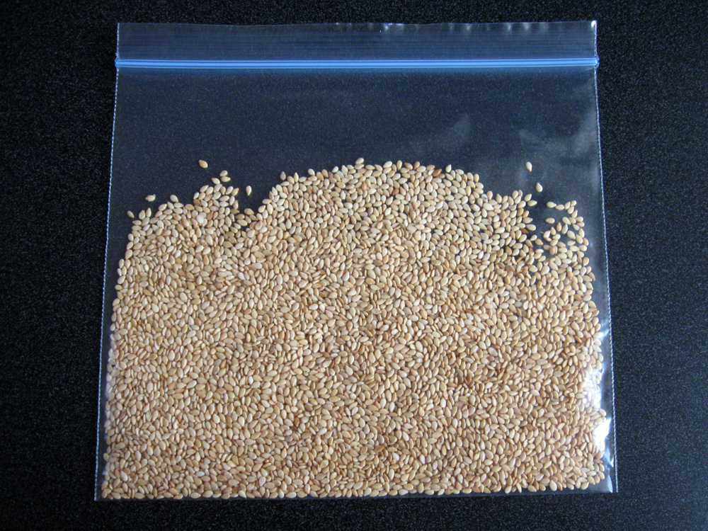 - Place the cooled toasted sesame seeds in a tough plastic bag. Seal the bag.