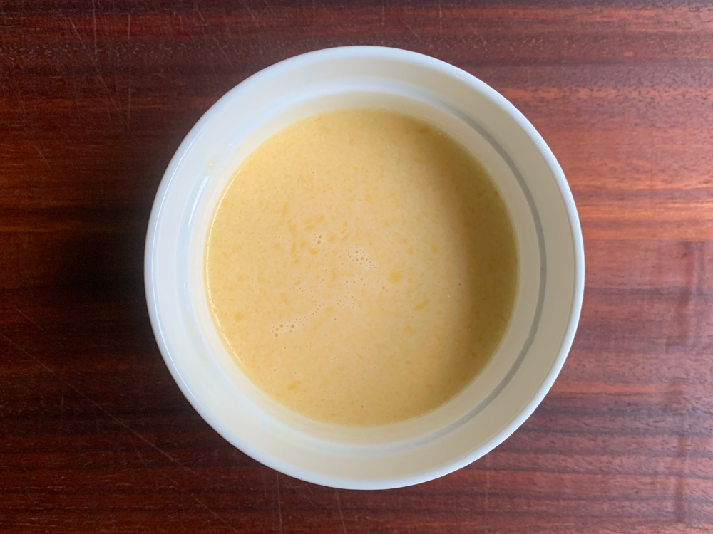 - Place Butter and Sugar in a ramekin OR mug, microwave for 10-20 seconds OR until Butter melts, and mix well. Add Vanilla and Egg, mix well, then add Milk, and mix well until smooth.