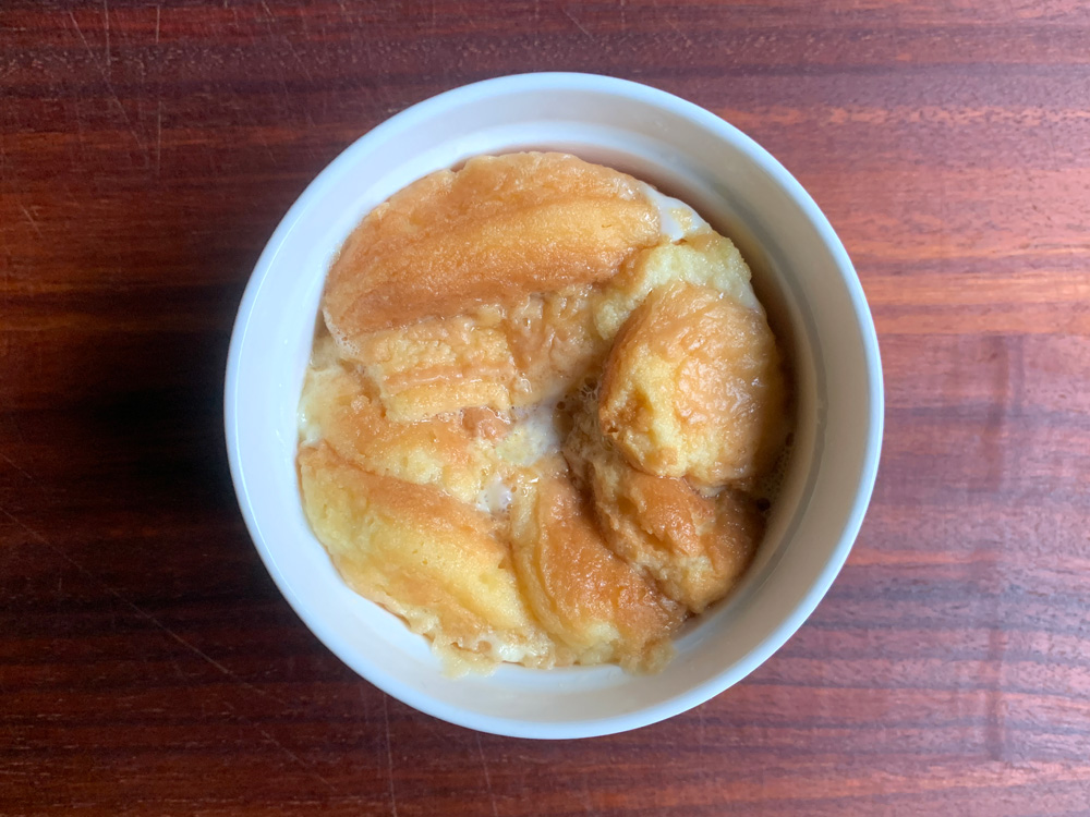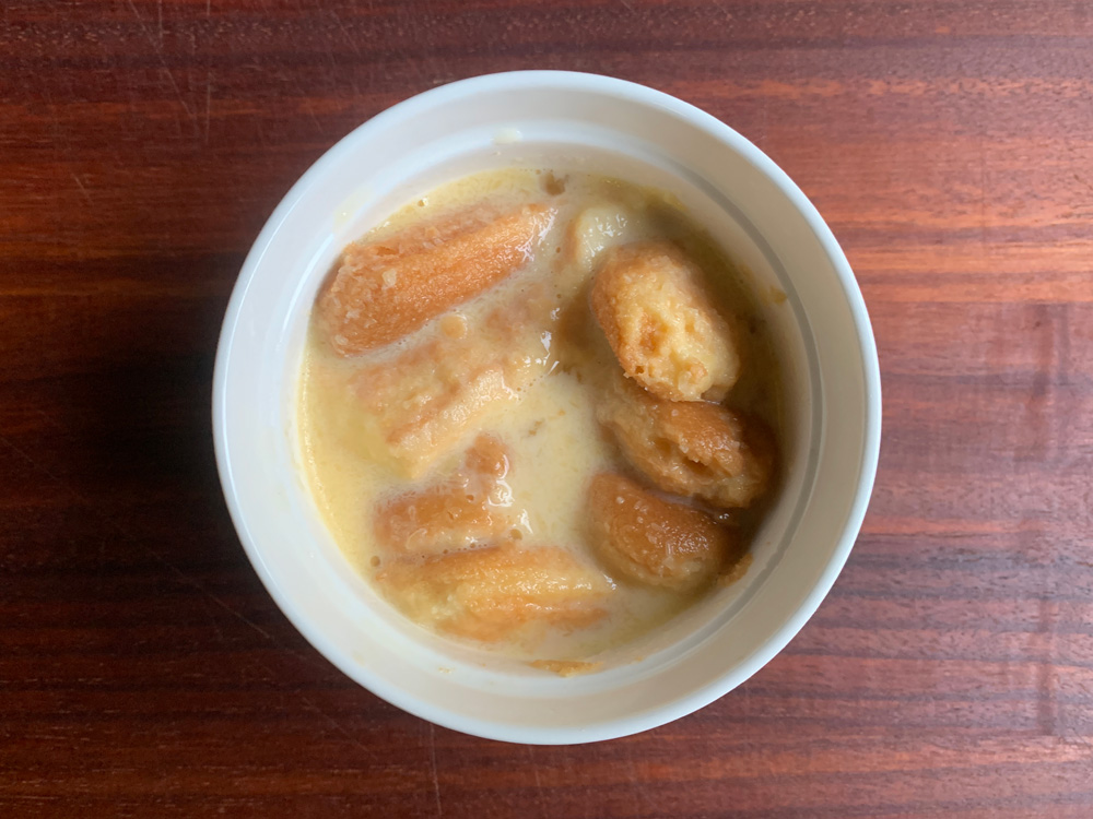 Every time I make ‘Turamisu’, I end up having some leftover Savoiardi (Sponge Finger Biscuits). If you have a microwave, this absolutely delicious pudding can be made in less than 5 minutes using the leftover Savoiardi. I would stock Savoiardi in my pantry to be able to make this quick and comforting dessert.