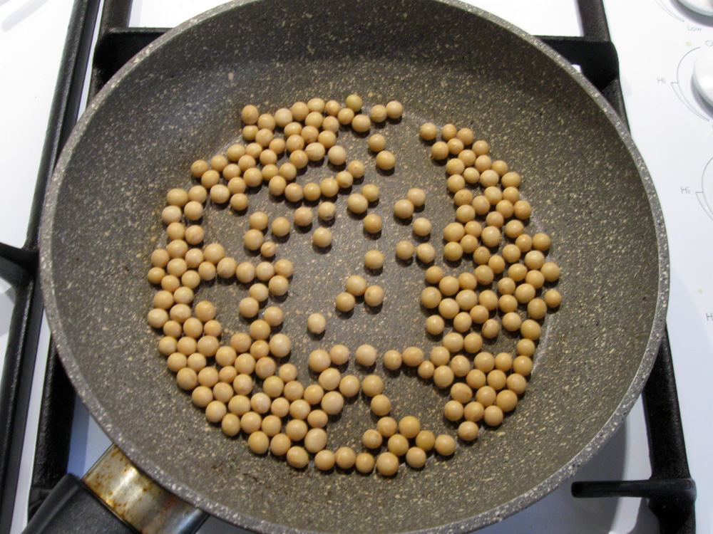 - Heat a frying pan, thick-base pan preferred, over very low heat, and cook Dried Soy Beans, stirring OR shaking the pan frequently, for 10 minutes OR until aromatic and the skin is cracked.