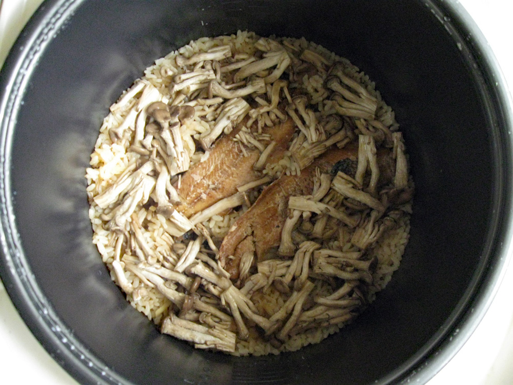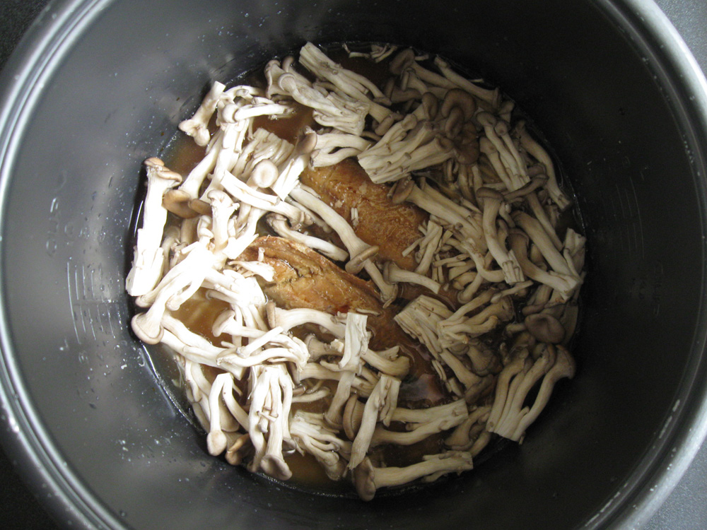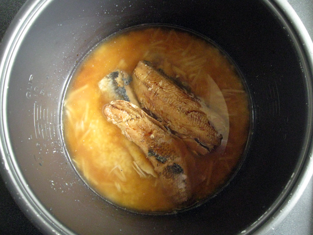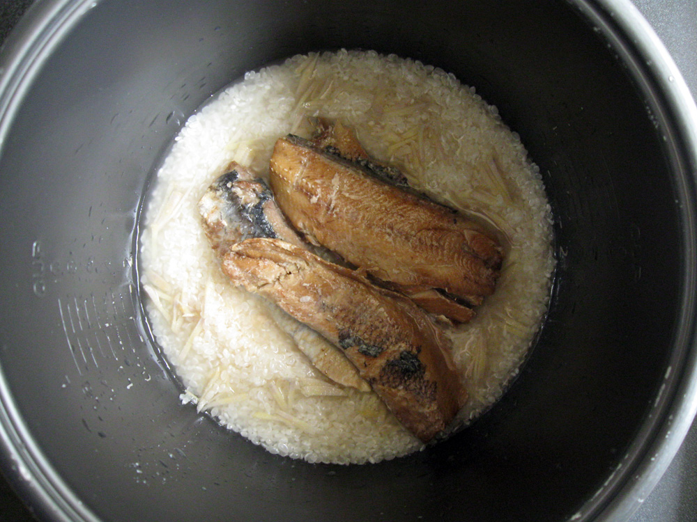 - Wash Rice, drain, and place in the rice cooker’s inner pot. Scatter Ginger and empty the can of Kippers into the pot, that means all brine as well. *Note: If you use Kippers in Oil, discard the Oil.