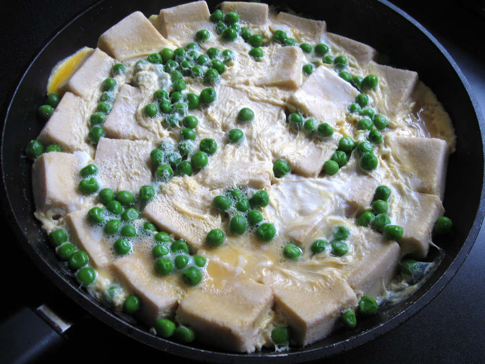 - Pour whisked Eggs over Kōya Dōfu and Peas, but DO NOT stir. Cover with the lid and simmer until Egg is softly set.