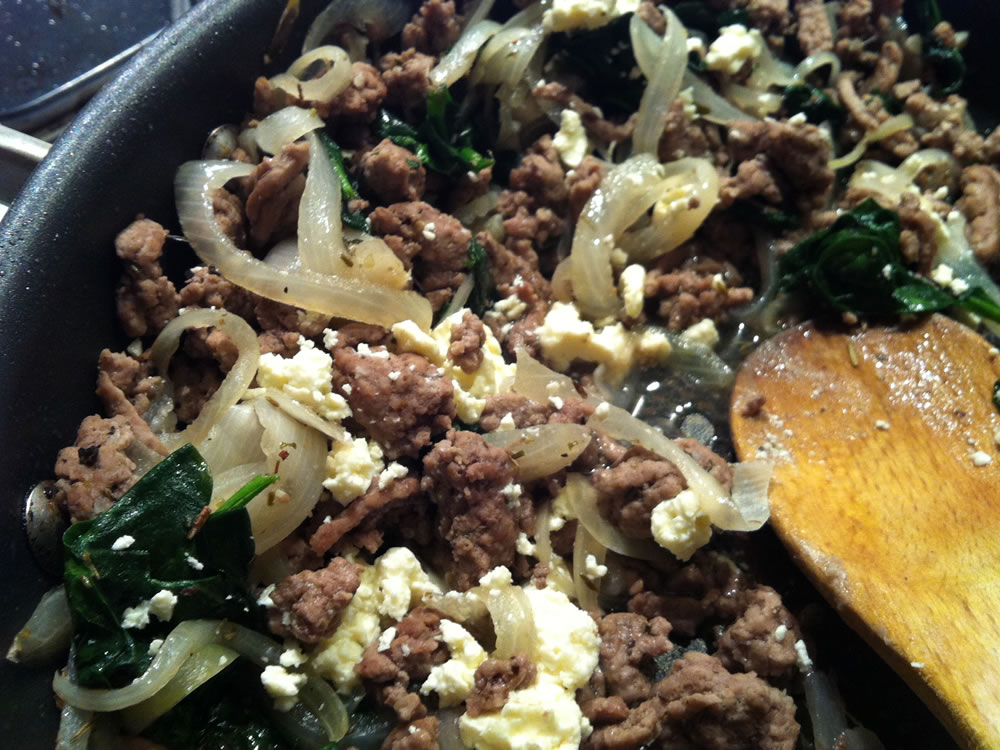 - Heat a fry pan, cook Lamb Mince, sliced Onion and Garlic. When Lamb changed colour and Onion is soft, add a big handful of Baby Spinach and season with Salt & Pepper.