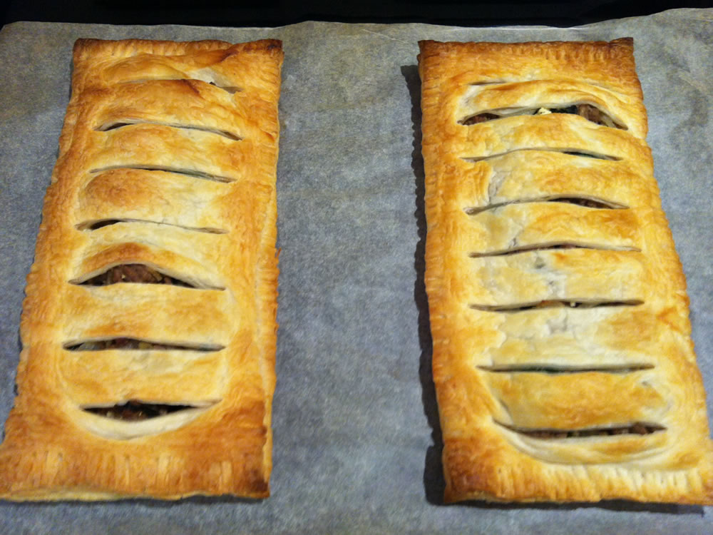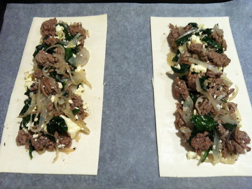 - Lay 2 sheets of pastry on non-stick baking paper. Place the lamb mixture on the pastry sheets.