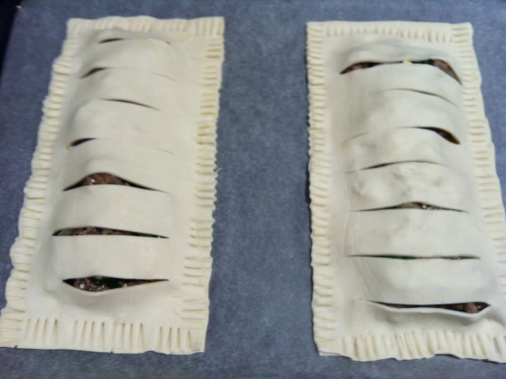 - Overlap the remaining sheets on top of the filling, press pastry sheets around edges using a fork. Make cuts on top.