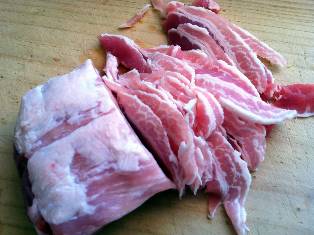 - Slice a block of Pork Belly (skin removed) as thinly as you can. *See ‘Notes & Tips’ Lightly season with Salt and White Pepper.