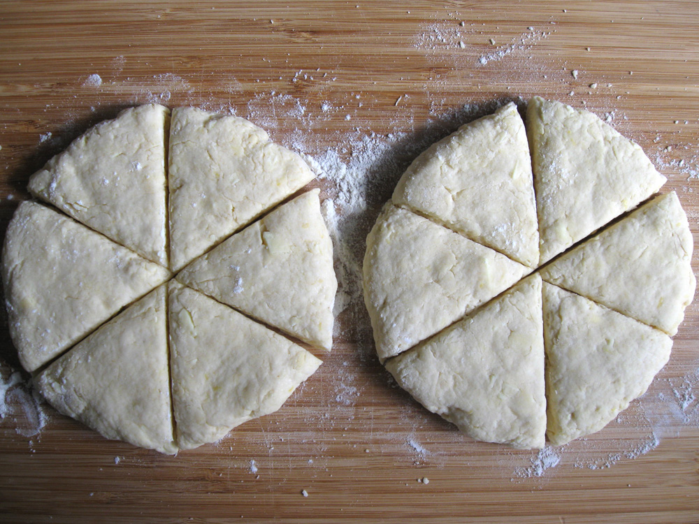 - Divide the dough in half. On a lightly floured surface, gently flatten each dough to 2cm thick round. Cut each round into 6 pieces.