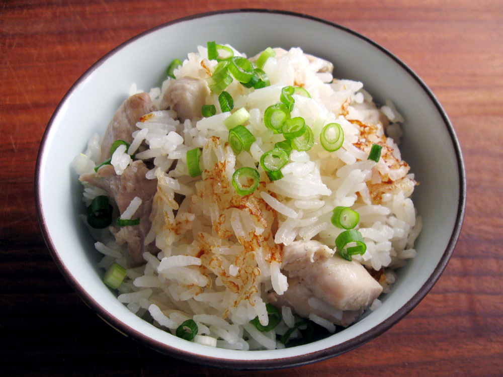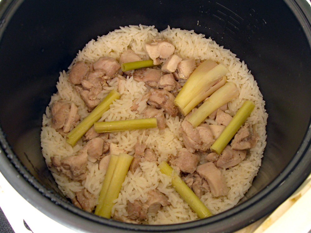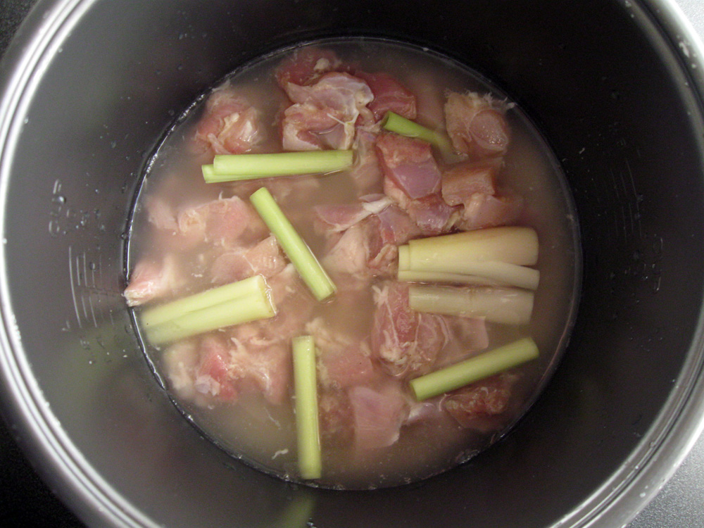 - Wash Rice, drain, and place in the rice cooker’s inner pot. Add Water and place Chicken pieces with all the liquid. Finally place Lemongrass pieces on top. Press ‘COOK’ button to start cooking.