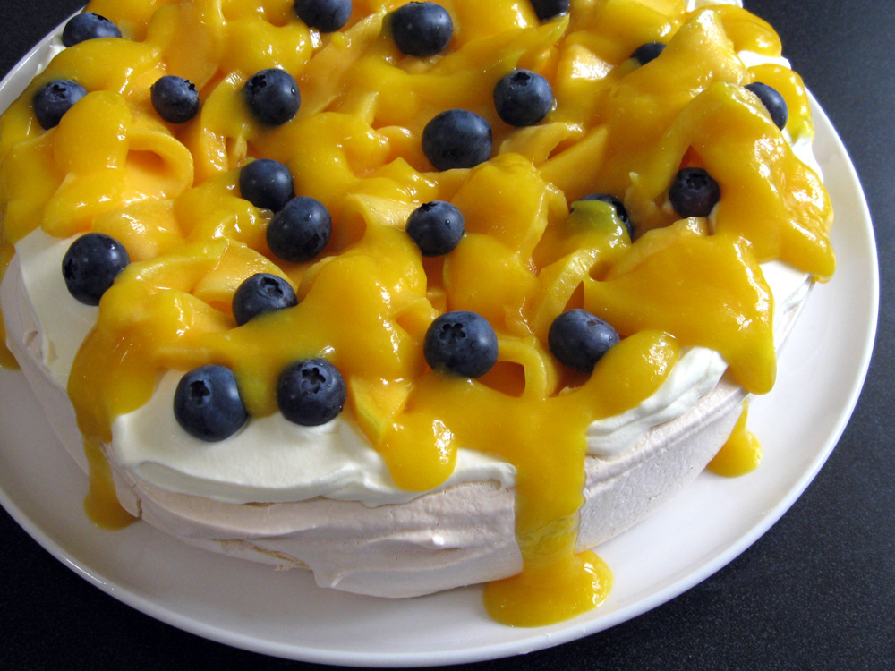 - Spoon the whipped Cream on top of meringue and decorate with Mango slices and Blueberries. Drizzle Mango Purée over and serve immediately.