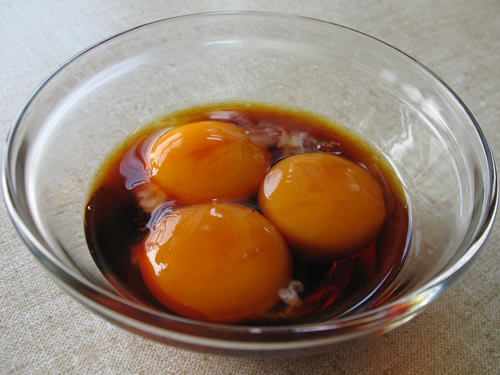 - Let the Egg Yolk(s) soaked in the marinade of Soy Sauce and Mirin for a couple of days in the fridge.