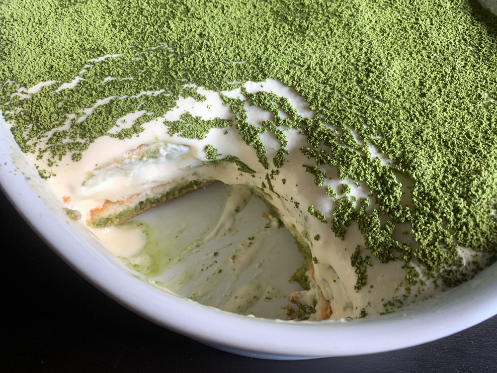 - Stir the cooled Matcha Tea, dip Sponge Fingers very quickly into the Matcha Tea, and line them in one layer in a large dish. You can break some to fit them in. (Stir the Matcha Tea occasionally.) Spoon half of the filling over the Sponge Fingers and smooth the surface.