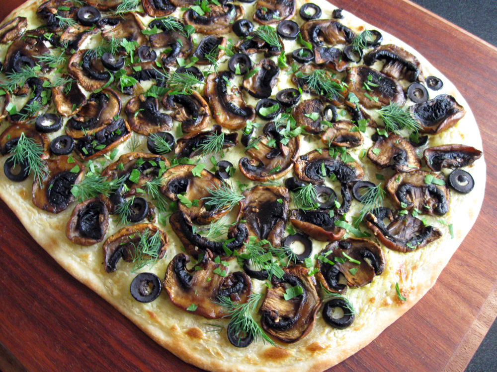 I must credit my friend Shelley for this recipe. The other day, she cooked 4 different Pizzas for my husband and me, and one of them was Mushroom and Black Olive Pizza, that inspired me to make this Flammkuchen. ‘Do not spread fresh Mushrooms over the Pizza base as a fair bit of water comes out from the Mushrooms and it make the base soggy. Cook Mushrooms first and intensify the flavour, then spread them over the base’, Shelley said. I cooked Mushrooms with Garlic. This Flammkuchen smelled and tasted amazing. Dill is essential! Find more Flammkuchen recipes.
