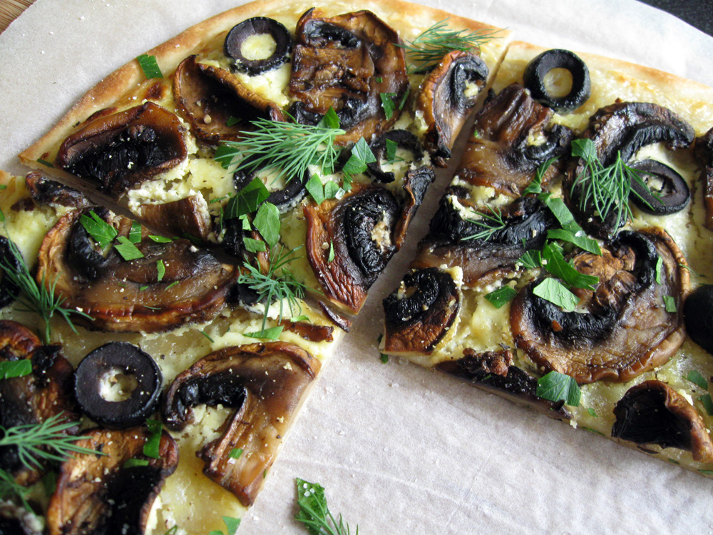 - Mix Sour Cream (OR Creme Fraiche) and Salt, spread over the base, arrange cooked Mushrooms and sliced Black Olives evenly.