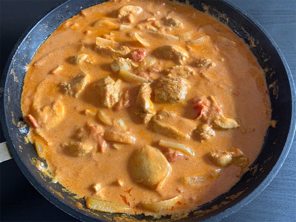 - Cook for 10 to 15 minutes. When the sauce is thickened, add Cream, and mix to combine. Add extra Salt as required and it is done. Serve with freshly cooked Rice. *Note: You may wish to add some Parsley OR Coriander Leaves.