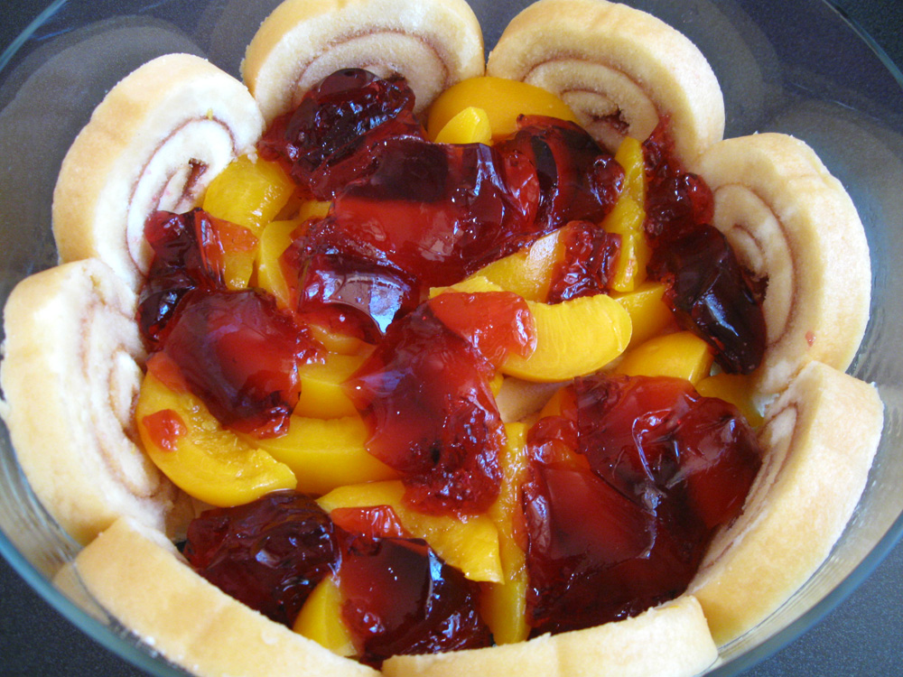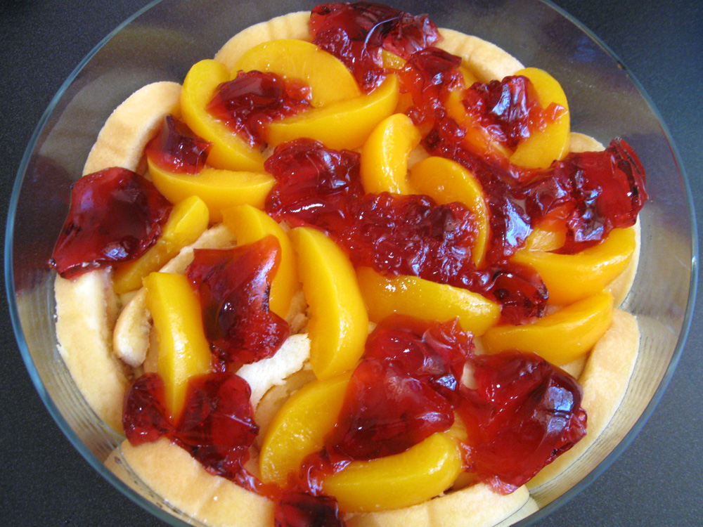 - Place 1/2 of Peaches. Spoon 1/2 of set Jelly. Cover with Thick Custard.
