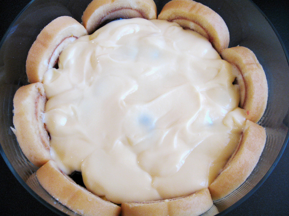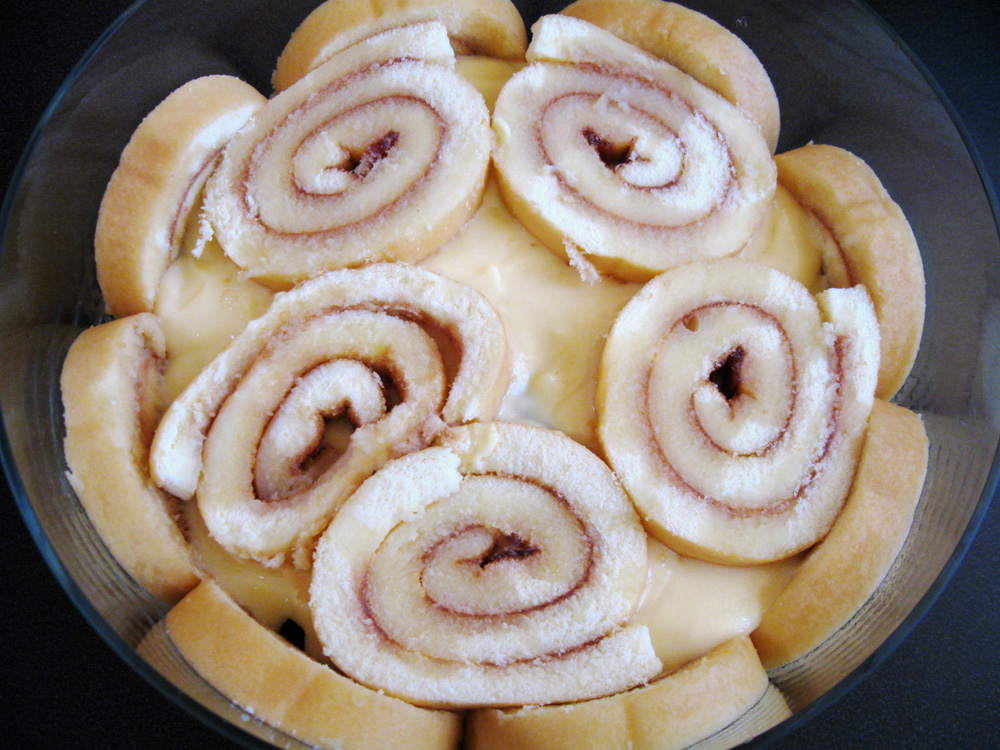 - Cut Jam Sponge Roll into 15-20mm thick slices. Sprinkle with Sweet Sherry (OR Syrup), save 4-5 slices, and arrange them over the base and side of a Trifle bowl or large serving bowl.