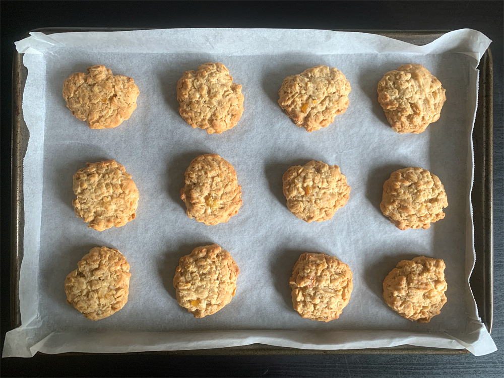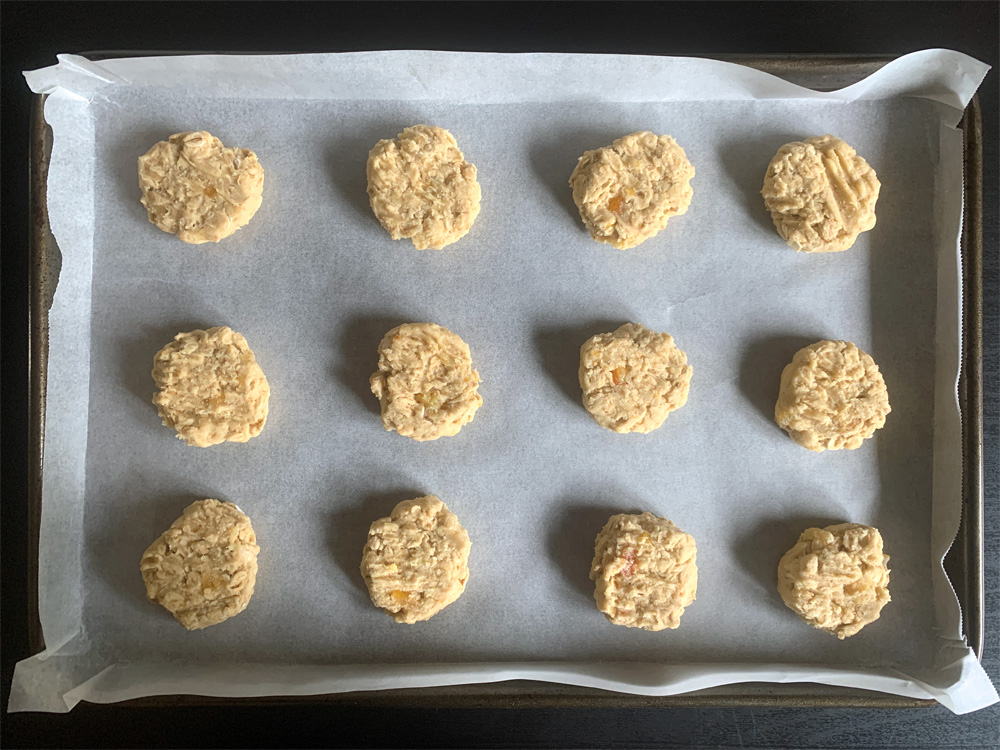 Today is March 12, it’s Auntie Joan’s birthday, and that reminded me her Orange Marmalade was getting old. Auntie Joan gives us a jar of her homemade Marmalade every year, but we don’t eat Marmalade. So, I use it to make cakes such as ‘Orange Marmalade & Whisky Pound Cake’. Today I made these Cookies instead, using my basic cookie recipe replacing Egg with Joan’s Orange Marmalade. I also replaced some Flour with Rolled Oats. This is how I made them.