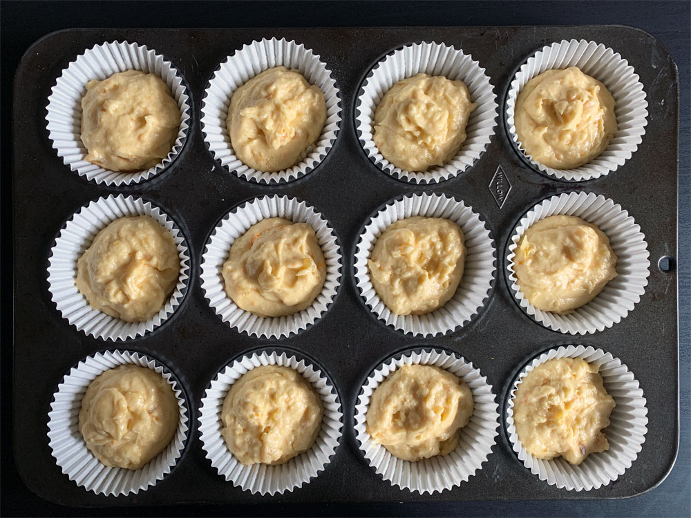 - Preheat oven to 170℃. Line a 12-hole medium-size muffin tin with paper cases.