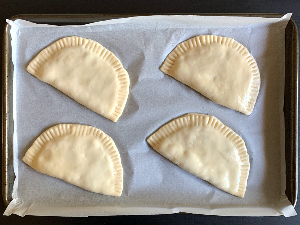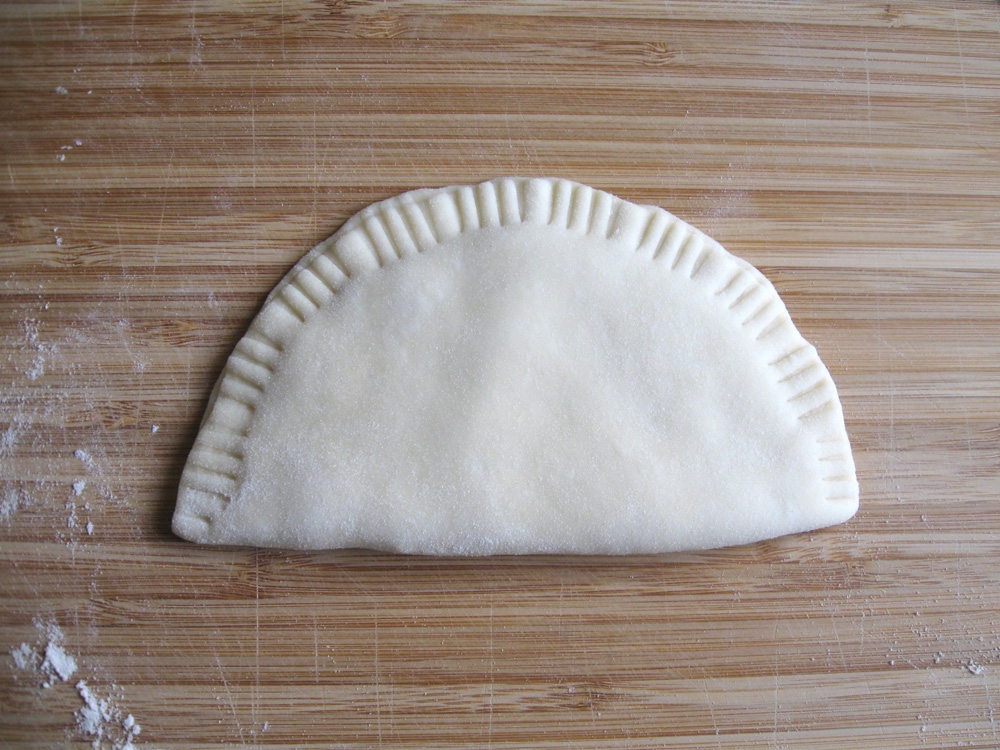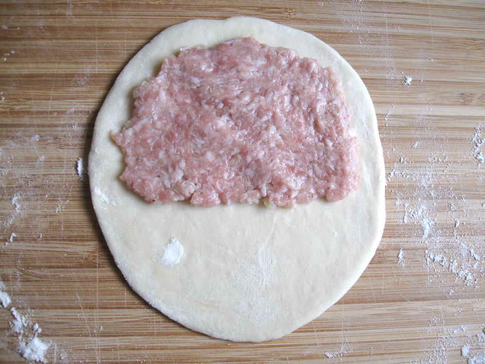 - Roll out the ball of dough into a round (OR oblong) about 2mm thin. Thinly spread the Meat mixture over 1/2 of the round, leaving the edges, fold in half, then gently press down to remove air, and seal the edges by pressing down with a fork.
