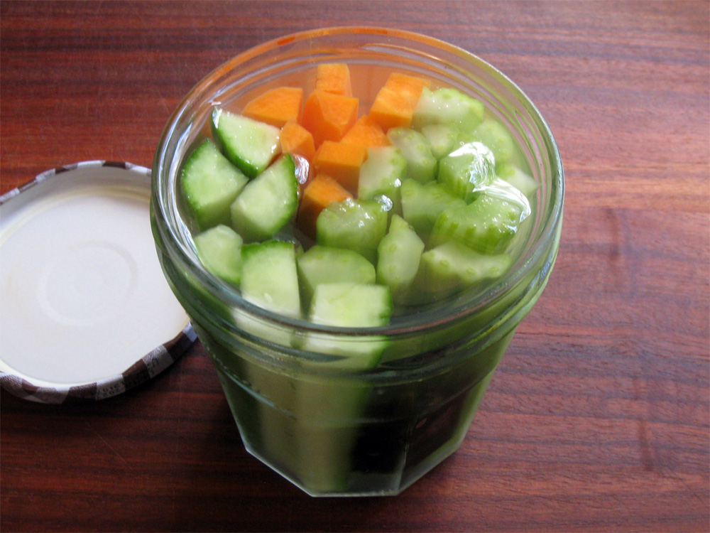 - Cut Vegetables in the length that is suitable to pack a jar or container, peel if necessary, and cut into 8-10mm thick sticks. Pack a jar OR container with the sticks. *Note: Cucumber can be pickled quicker. Cut it into slightly thicker sticks.