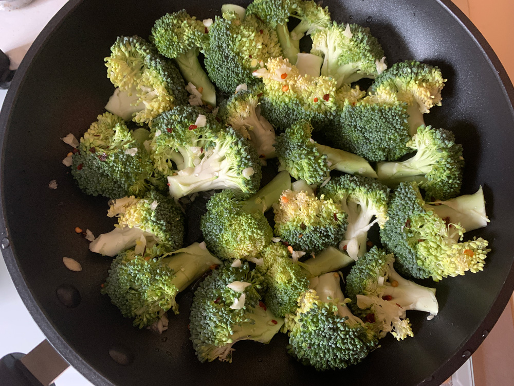 - Drizzle Olive Oil over a non-stick frying pan and arrange Broccoli pieces. Add Water, sprinkle with Salt, Garlic and Chilli (OR Pepper). Cover with a lid and cook over medium heat for a few minutes.