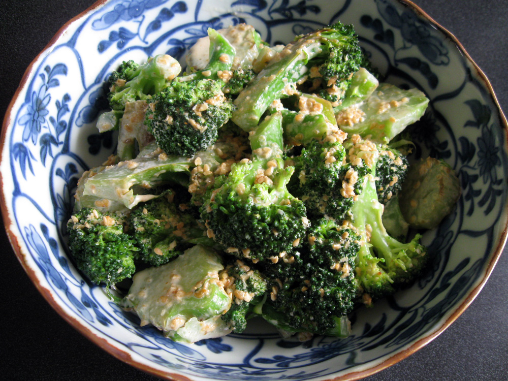 Steam-frying using a frying pan is the easiest method to cook Broccoli. Cheesy Sauce is really nice, but this super easy Creamy Sesame Sauce is also good. One large head of Broccoli would be eaten very quickly with this sauce.