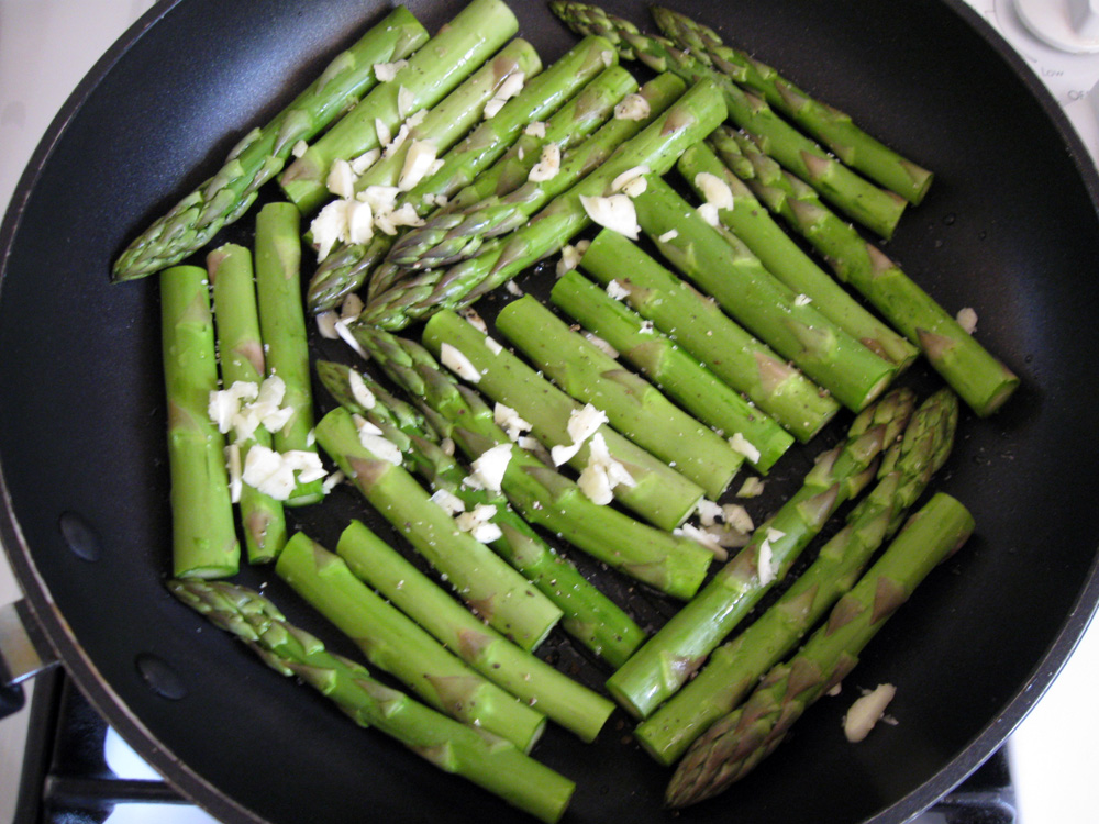 - Drizzle Olive Oil over a frying pan and arrange Asparagus pieces. Scatter with chopped Garlic. Sprinkle with Water, and Salt & Pepper. Cover with a lid and cook over medium heat for a few minutes.
