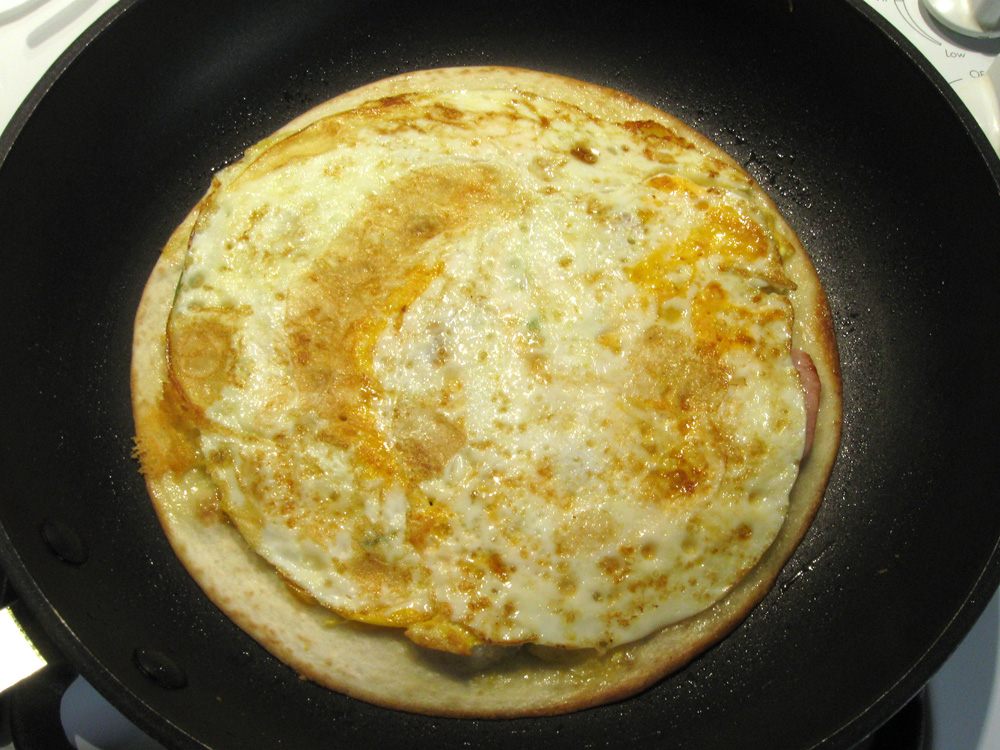 - Add some Sliced Cheese OR Shredded Cheese of your choice. Place a Tortilla on top, and cook until Egg is nicely browned and the Cheese is melted.